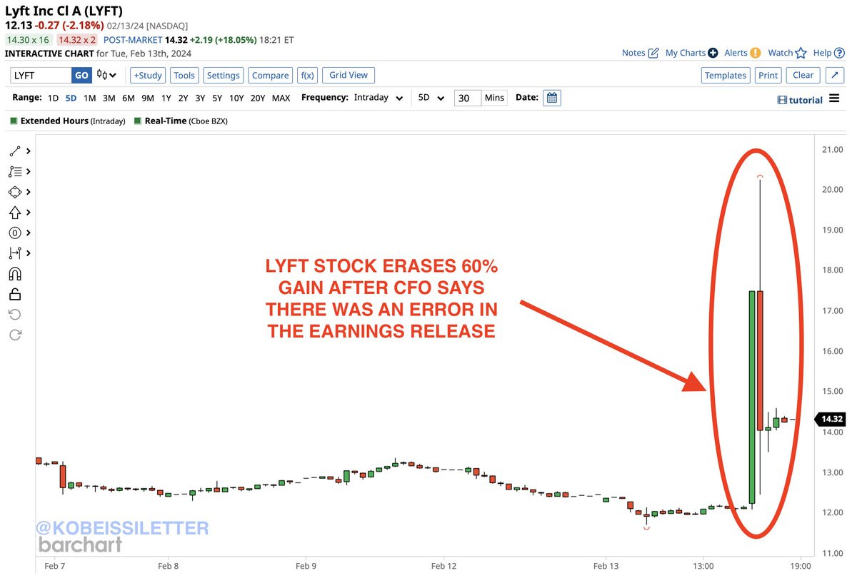Lyft stock drops 60% to “reasonable” level after abnormal surge due to “typo” in earnings report.