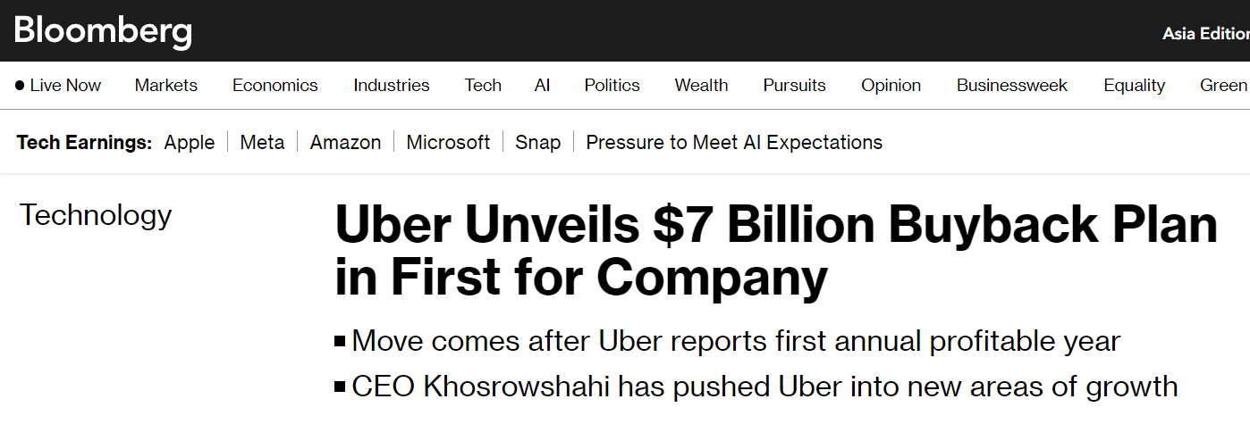 Uber buys back $7 billion in stock after first profitable year.