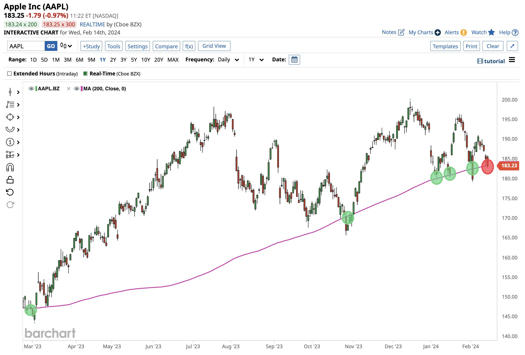 Frequency of Apple stock touching MA200 increasing, raising concerns about upcoming downtrend.