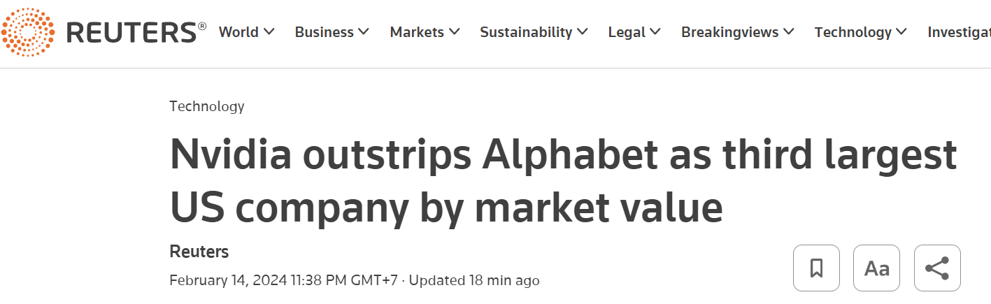 Nvidia surpasses Alphabet to become the third largest market cap company in the US.