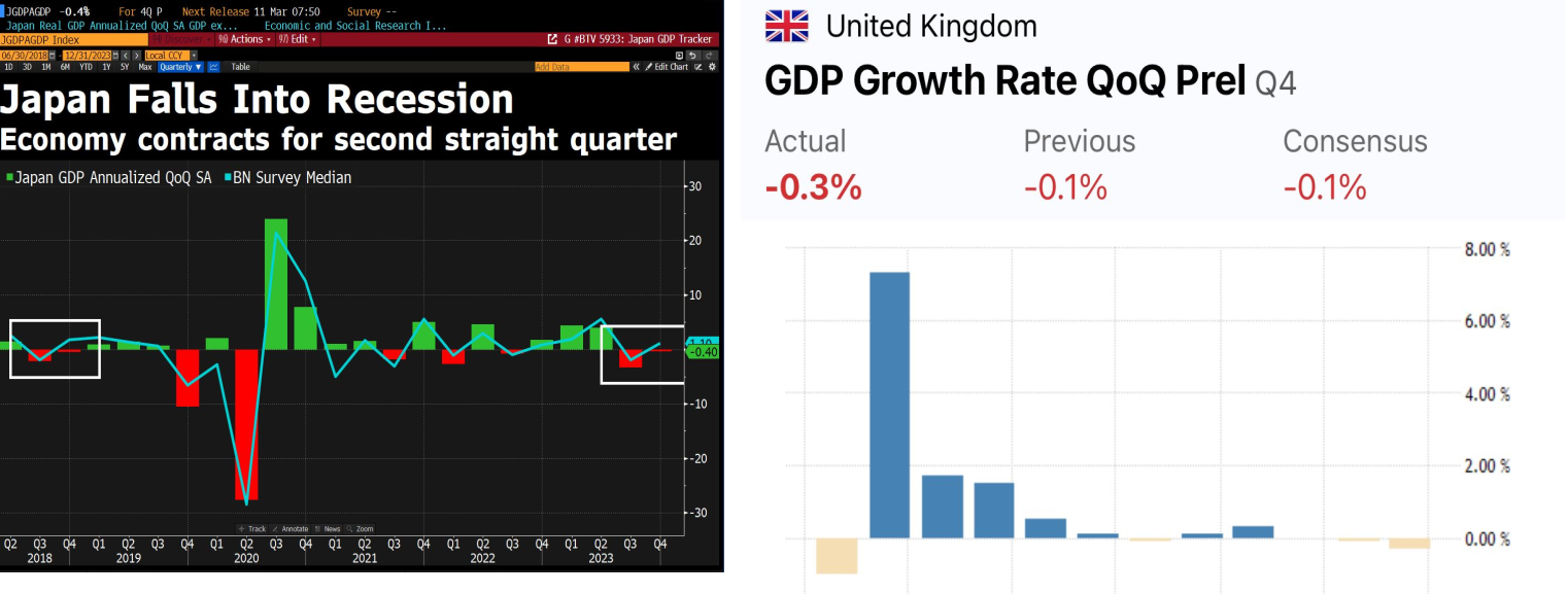 Both Japan and UK fall into technical recession (GDP down 2 consecutive quarters despite no rise in unemployment)