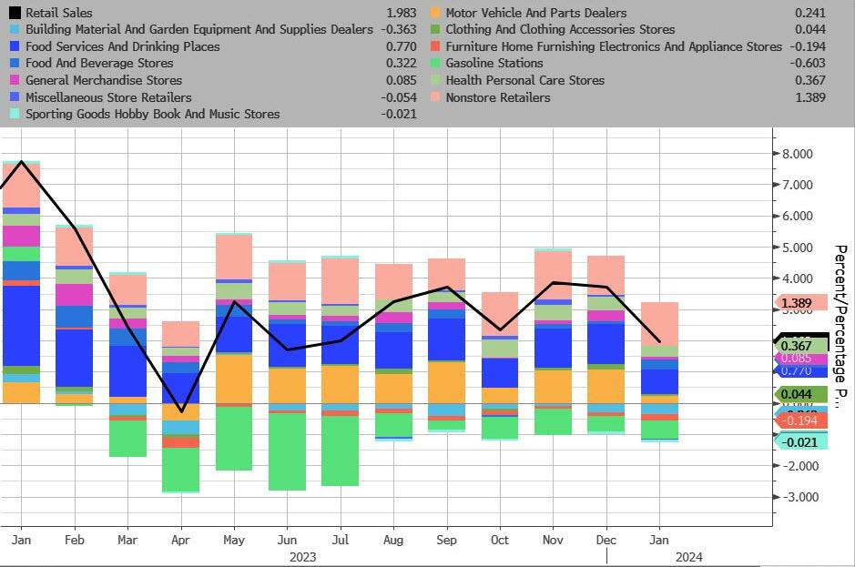 Contrary to the upward trend in 7/8 previous months, January retail sales (nominal) declined -0.8% MoM (worse than expected -0.2% MoM).