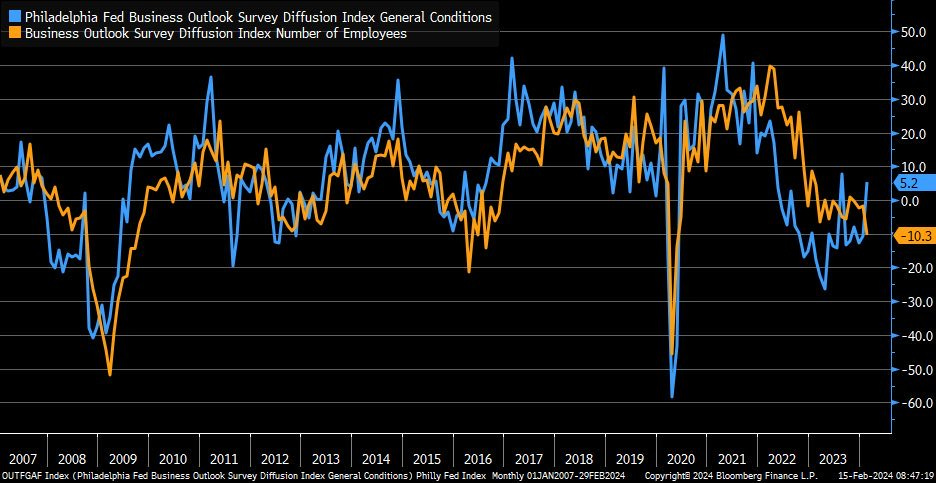 February Philly Fed manufacturing index rises to +5.2 (> -8.1 estimate & -10.6 previous).