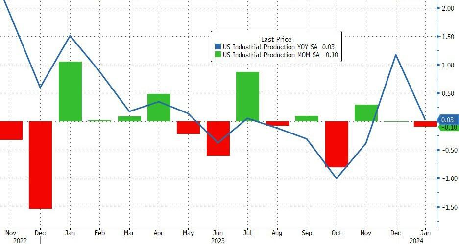 Overall industrial production index declines -0.1% MoM (< expected +0.3%), pulling annual growth down +0.03% YoY.