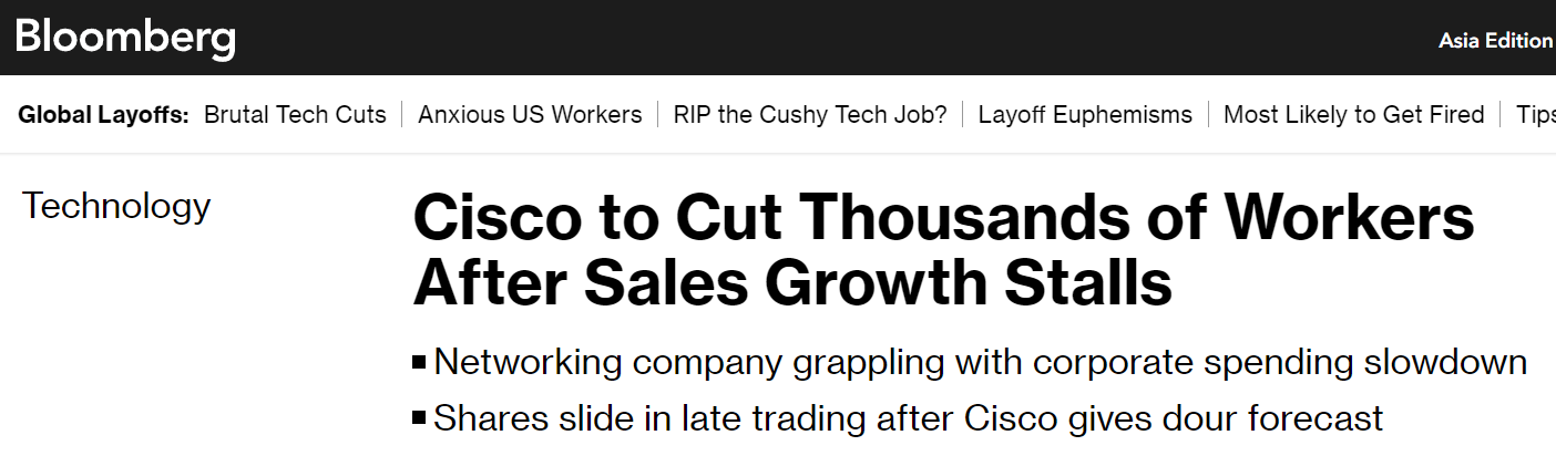 Cisco plans to cut 5% of workforce (~4,000 employees) due to declining sales.