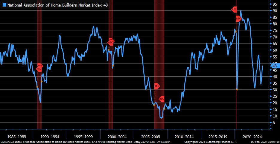 Builders' expectations (NAHB index) rise to 48 (> estimate 46), highest since August as mortgage rates cool.