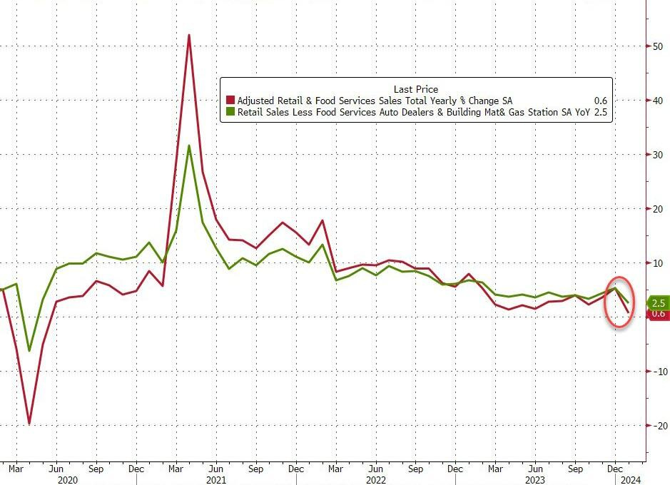 Core retail sales also declined -0.5% MoM (vs +0.2% expected), pulling the annual gain to the lowest since COVID.