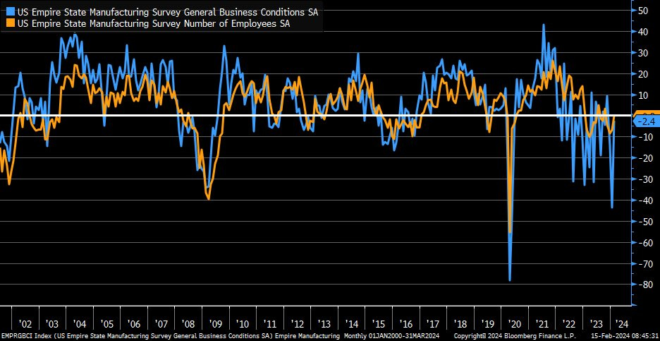February NY Empire Manufacturing Index recovers to -2.4 vs. significant decline last month (> estimate: -12.5 & previous: -43.7).