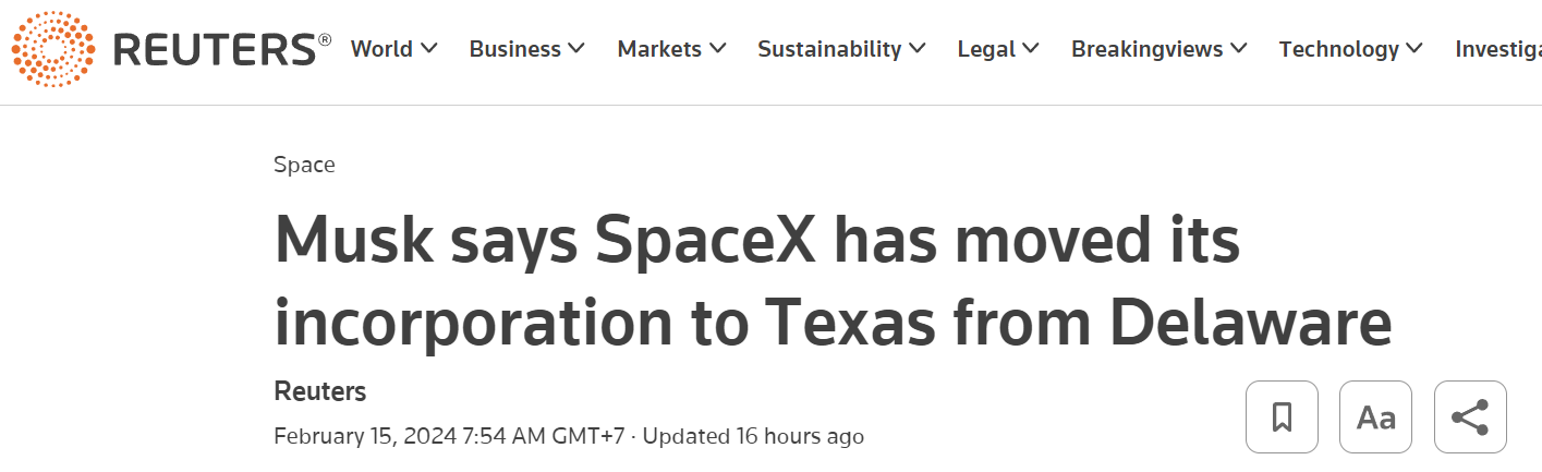 SpaceX officially moves incorporation from Delaware to Texas just weeks after Delaware court voids Elon Musk's $56 billion compensation package.