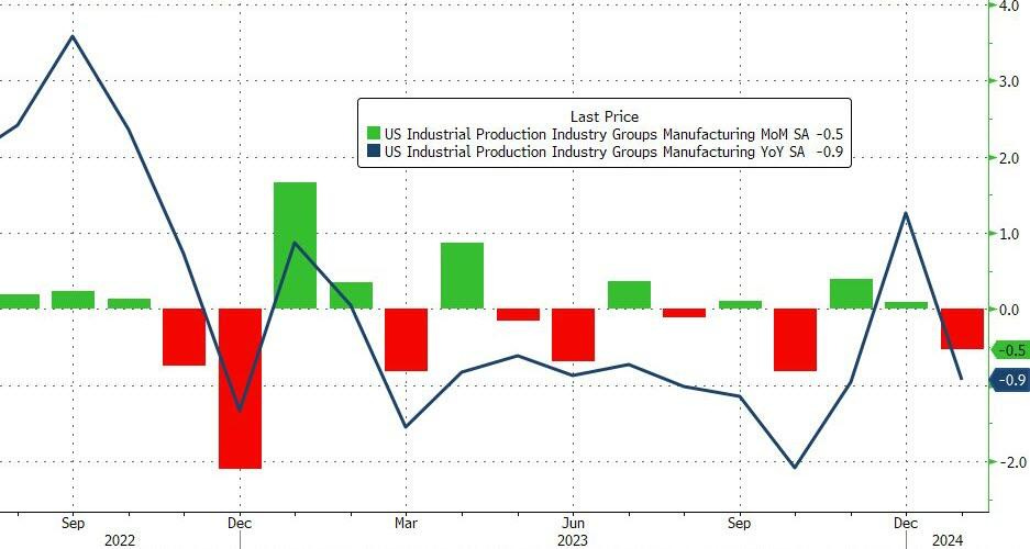 Industrial sector manufacturing output declines -0.5% MoM in January, pulling YoY down 0.9%...