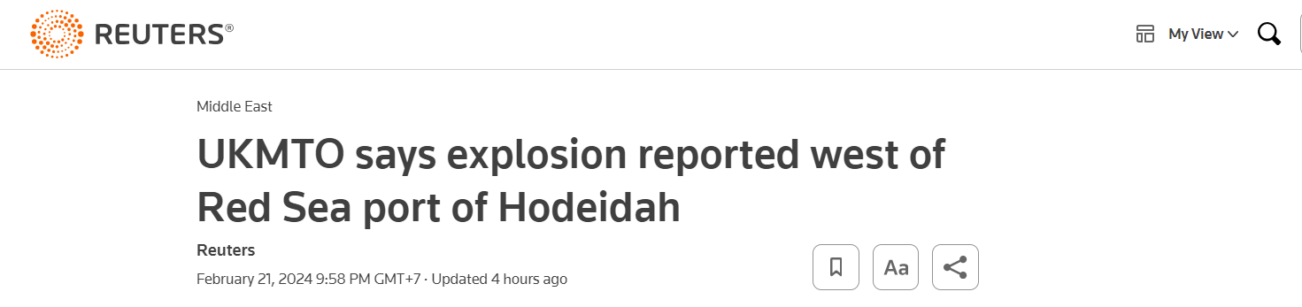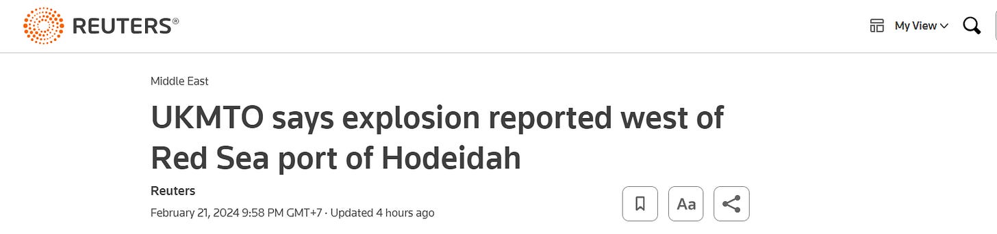 UK Maritime Trade Operations agency (UKMTO) reports an explosion and flash of light in the southern Red Sea, 40 nautical miles west of Yemen's Hodeidah port in the Red Sea.