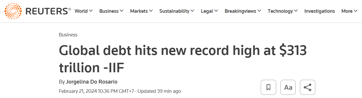Global debt total increased +15,000 billion USD in 2023, bringing total debt to record 313,000 billion USD