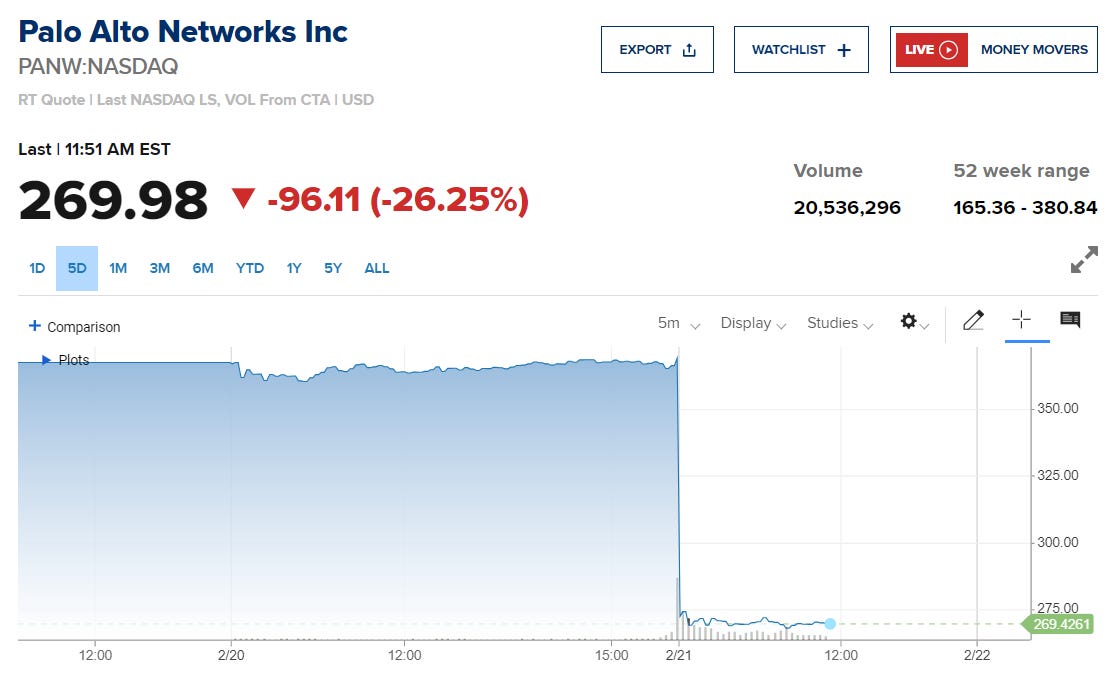 Palo Alto Networks stock drops -27% after cutting revenue forecast.