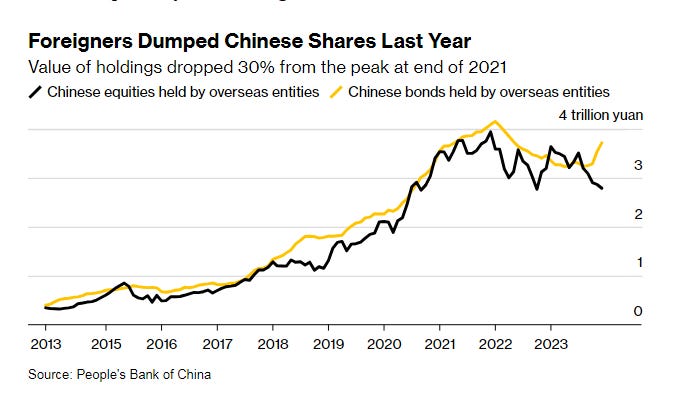 Foreign investors continue reducing Chinese stock holdings, with net withdrawal value 14.5 billion CNY (~2 billion USD) in January via Hong Kong exchange.