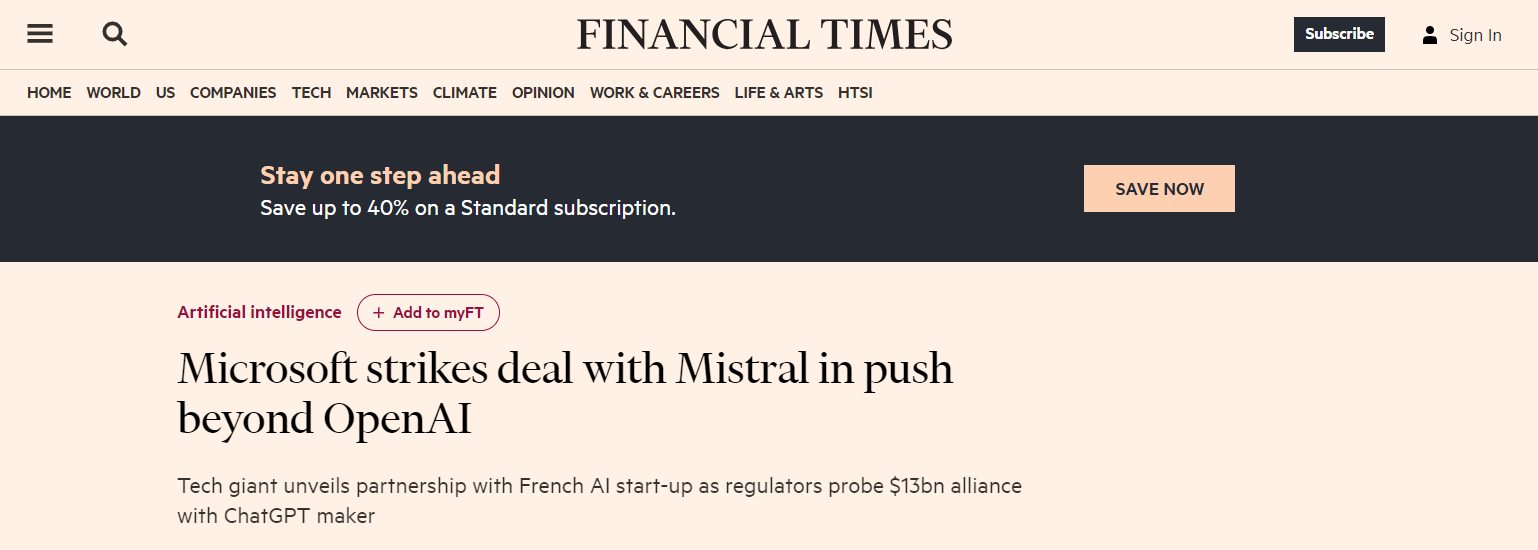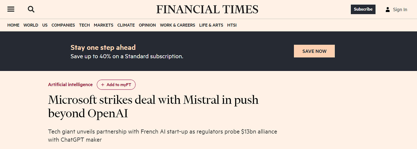 Microsoft partners with Mistral - French AI startup, to expand its competitiveness in this field, in addition to previous partnership with OpenAI