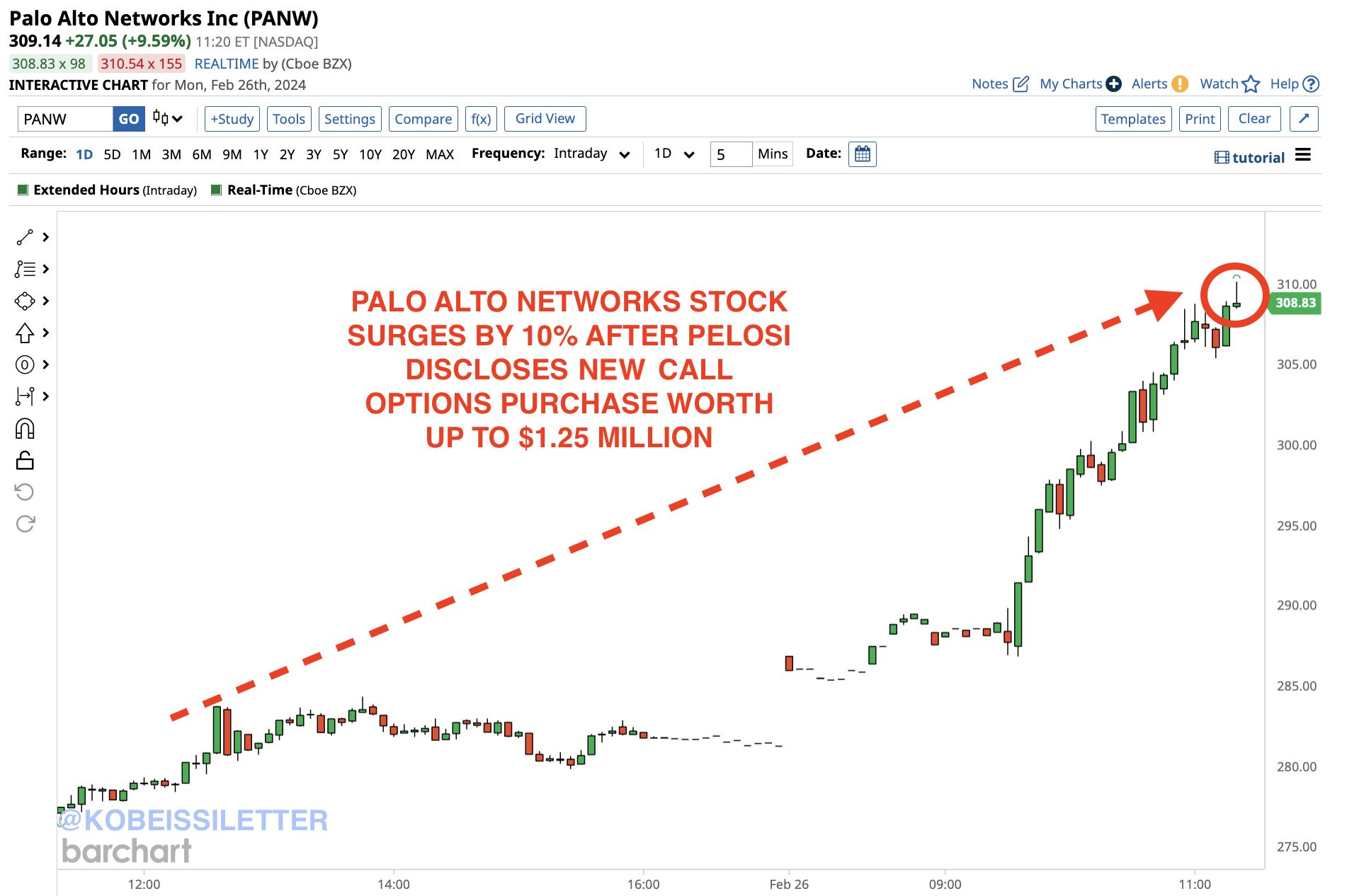 …after Pelosi's trade disclosure today, $PANW is up 10% in the morning session: