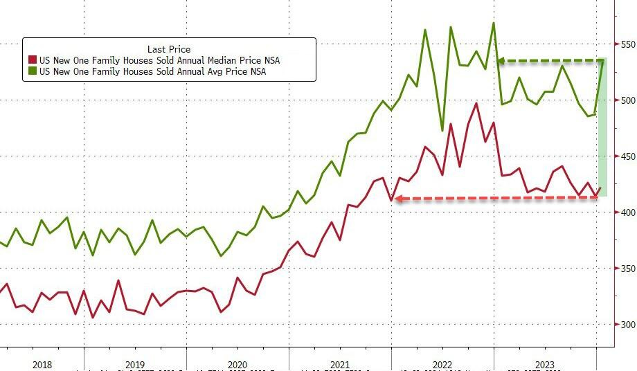 Median home price (50% of contracts) down to 420,700 USD: -2.6% Y/Y but average price up to 534,300 USD
