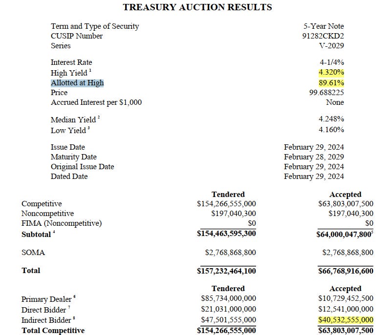 The nearly USD 67 billion 5Y Treasury bond auction session has a record high Allotted at High (amount of investors awarded at High Yield):