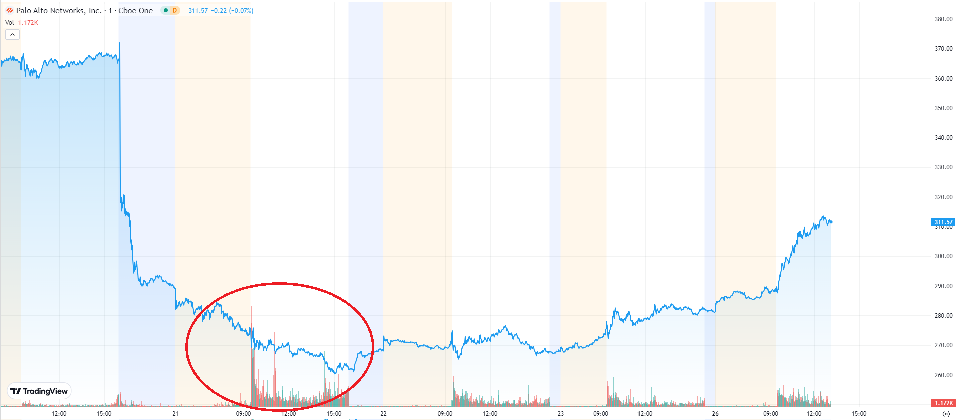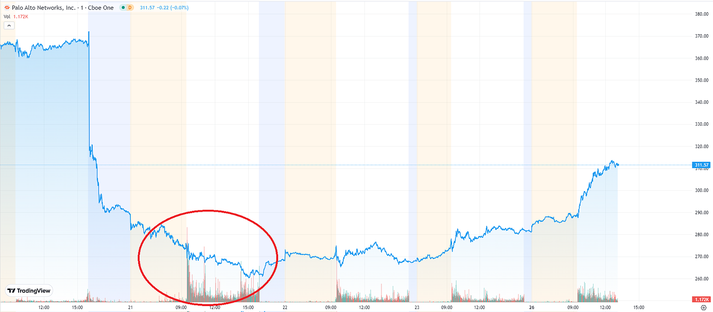 Pelosi's buy order was placed right on 02/21, just in time to catch the bottom when PANW dropped >-30% after earnings report: