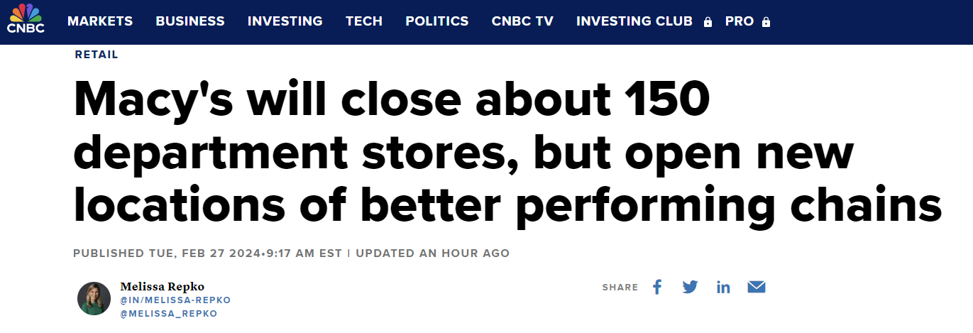 Macy’s announces closure of 5 stores and layoffs of > 2,300 employees in January.