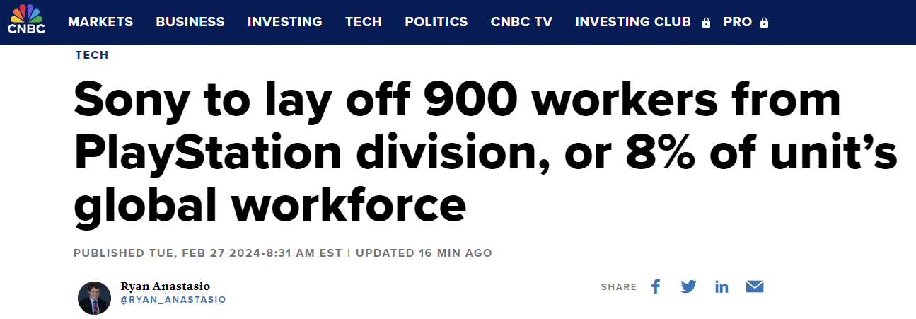Sony cuts 8% of PlayStation workforce (~900 employees) after cutting PlayStation 5 sales forecast due to low demand.