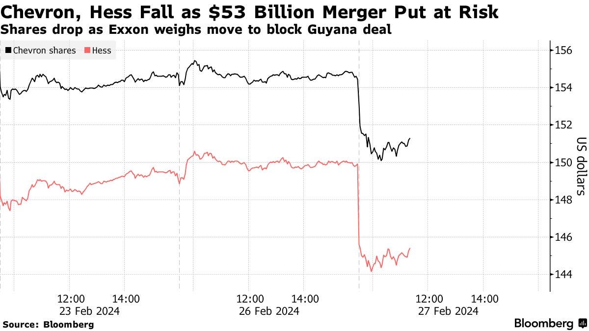 Chevron's $53 billion merger with Hess threatened as Exxon claims it may exercise right of first refusal to buy Hess's 30% stake in Guyana oil block.