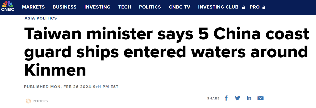 5 Chinese coast guard ships enter Taiwan's waters: tensions escalate after 2 Chinese citizens killed while trying to flee Taiwan's coast guard forces.