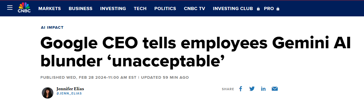 Google CEO Sundar Pichai admits the company's mistake as AI Gemini produced ethnically biased images and answers.