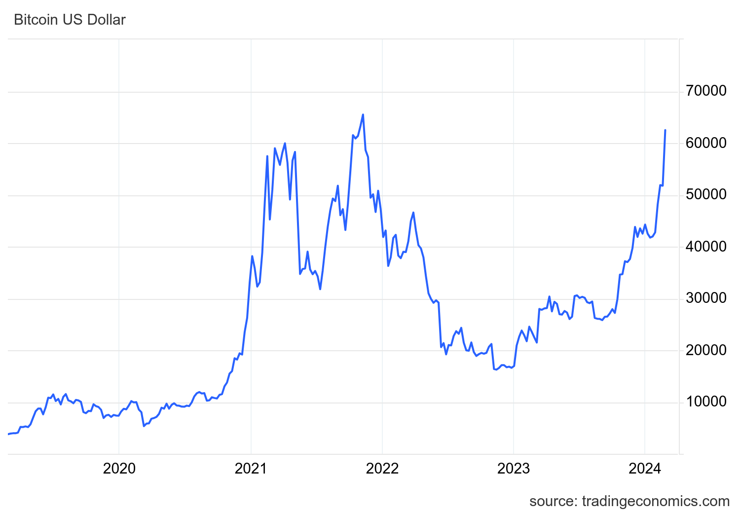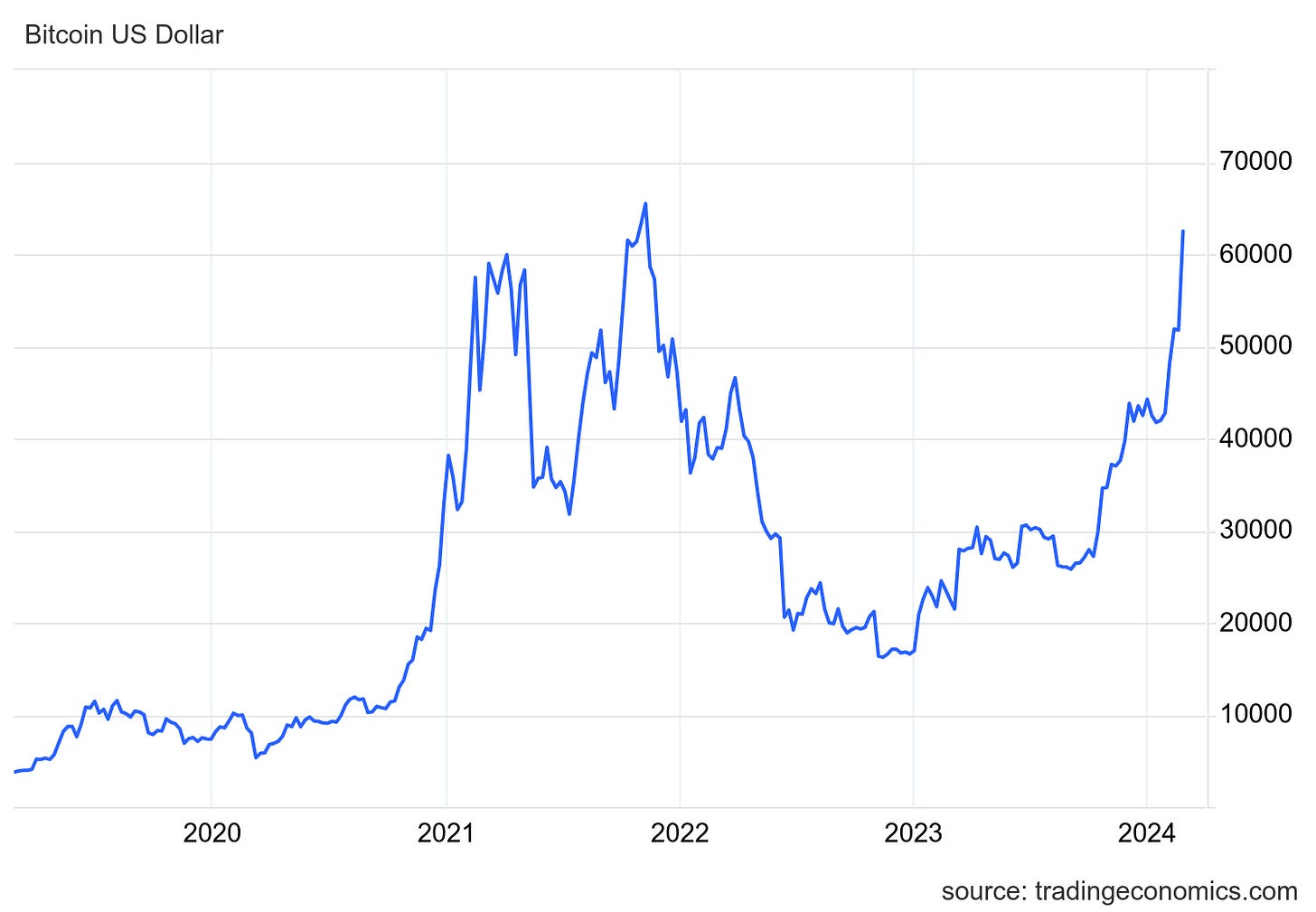 Bitcoin surpasses 60,000 USD threshold, approaching historical high of 65,000 USD in Nov 2021