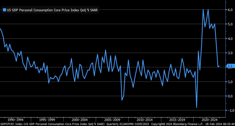 Q4/2023 core PCE growth also revised up to +2.1% Q/Q following consumer spending (from previous +2% Q/Q).