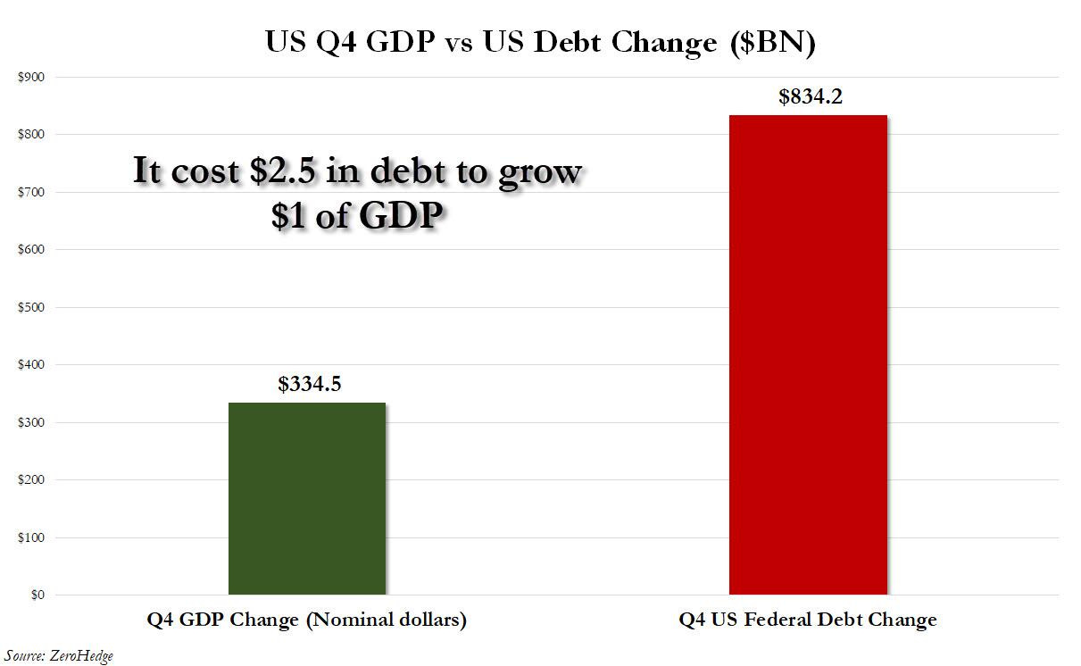 Q4 GDP up +334.5 billion USD vs Q3, but public debt up a whopping 834.2 billion USD in just 1 quarter → For every 1 USD increase in GDP, traded by 2.5 USD increase in public debt