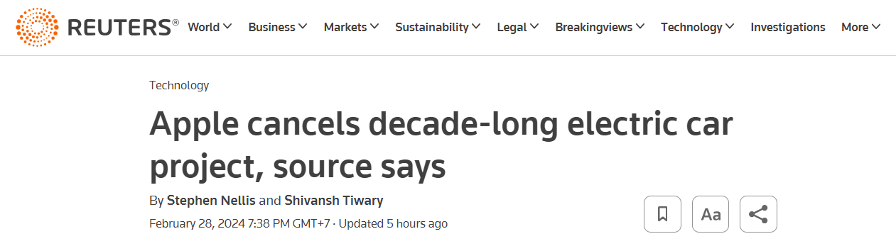 Apple is said to have canceled its electric car production plan, surprising nearly 2,000 employees working on the project.