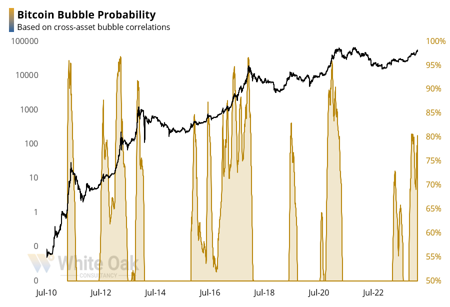However, the predicted probability of a Bitcoin price bubble has risen to ~100%.