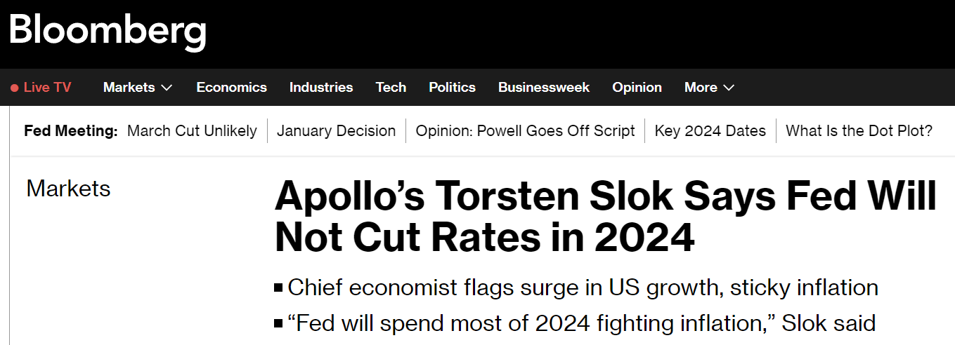 According to Torsten Slok, Chief Economist at Apollo Global Management, "Fed will not cut rates this year and rates will stay higher for longer."