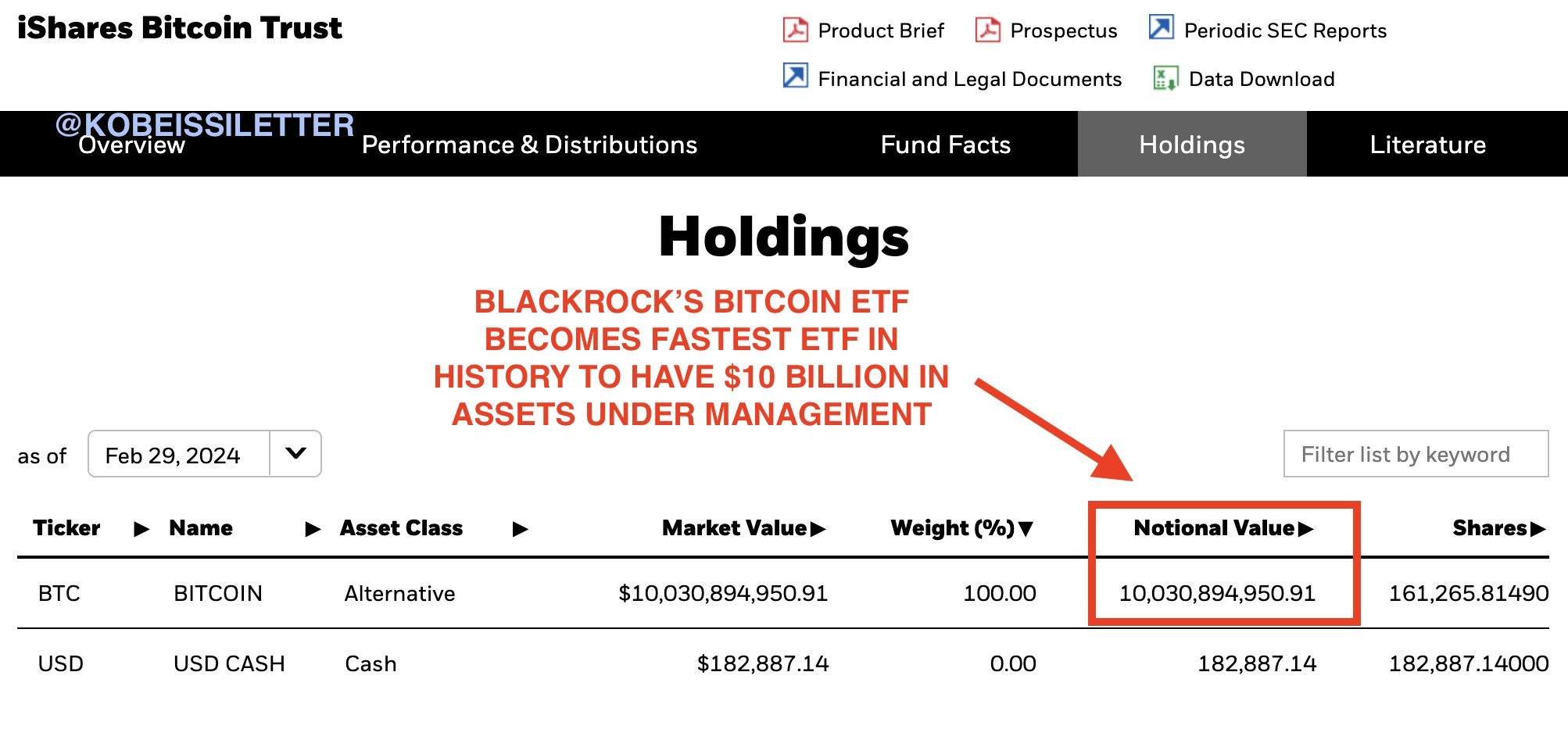 BlackRock's Bitcoin ETF (IBIT) reaches record 10 billion USD in assets under management.