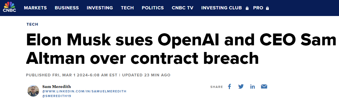 Elon Musk sues OpenAI and CEO Sam Altman for violating founding principles, “not fulfilling the mission to develop artificial intelligence for the common benefit of humanity”.