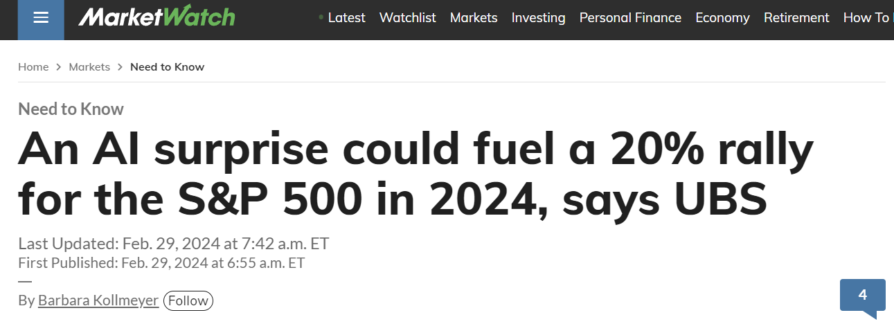 According to UBS, AI growth could drive S&P 500 up 20% in 2024.