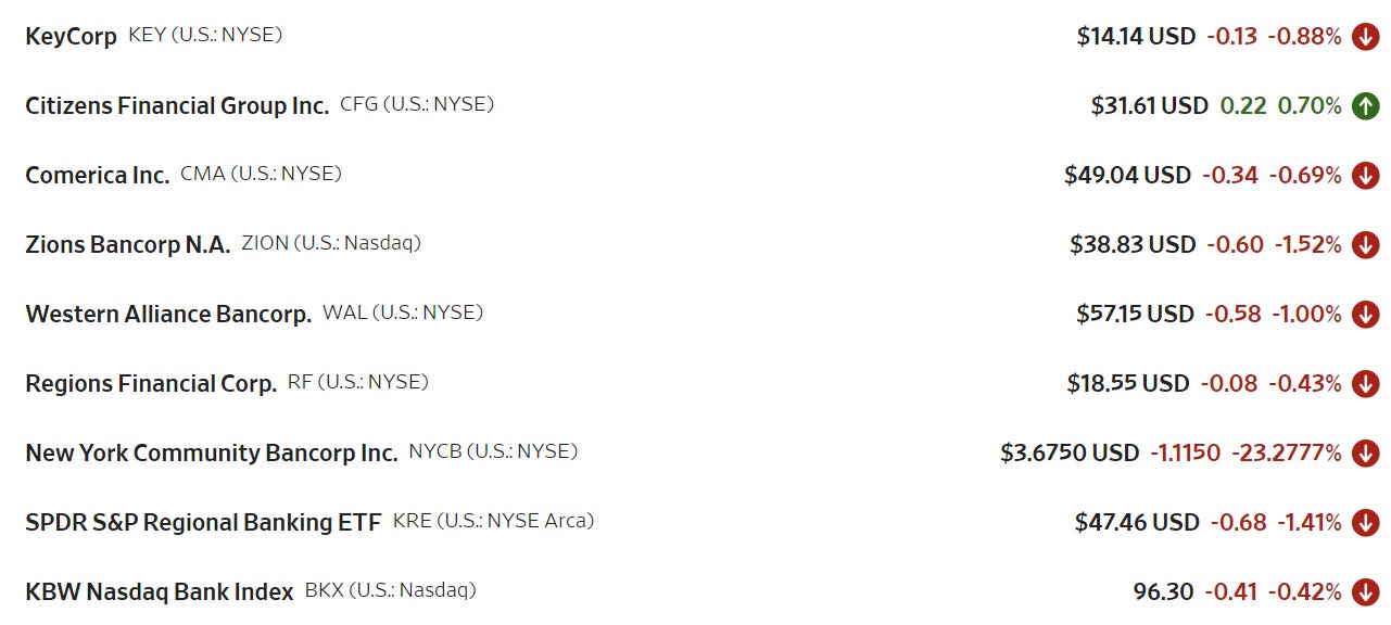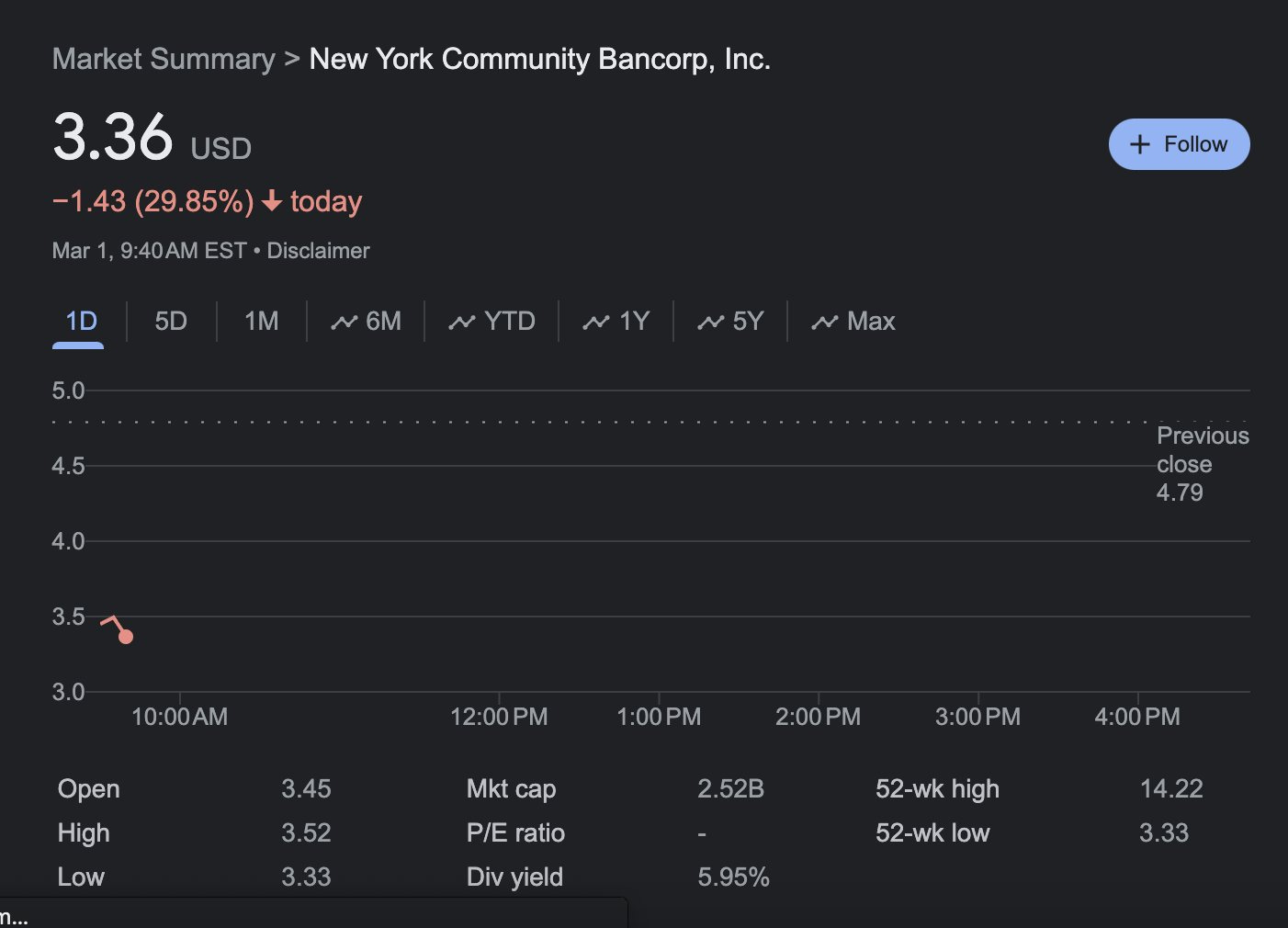 NYCB shares continue to plummet more than 30% (lowest level in 27 years).
