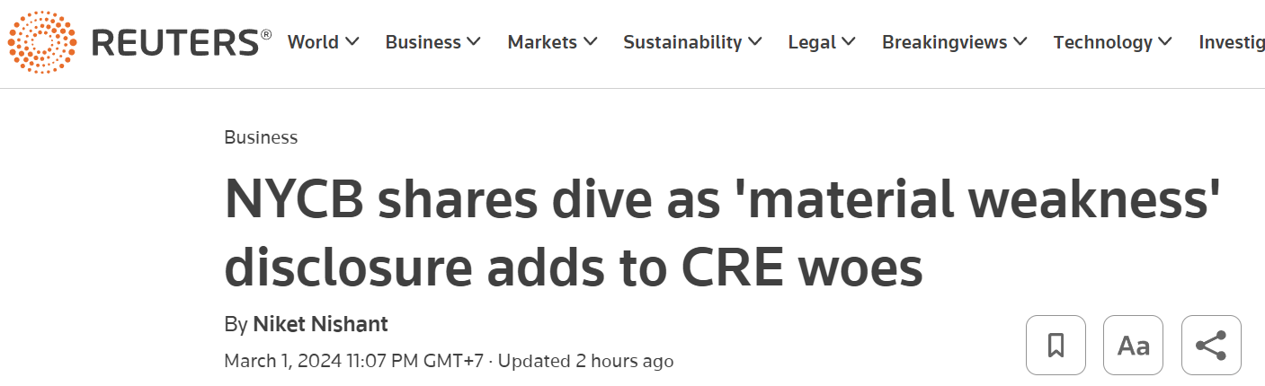 Recently, New York Community Bank reported issues “weaknesses in internal control processes related to loan reviews”.