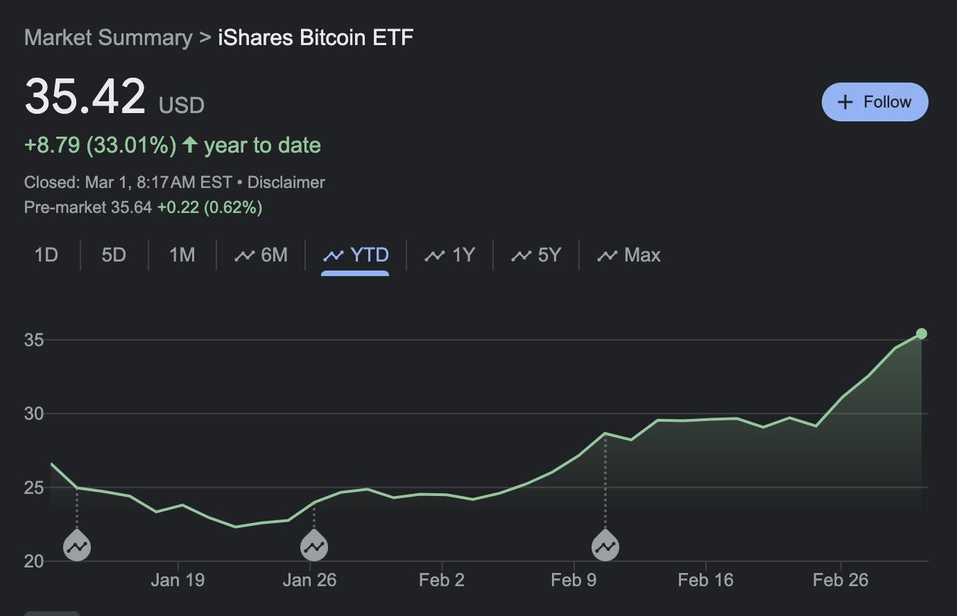 Since its launch on 01/11, IBIT has increased up to 33%.