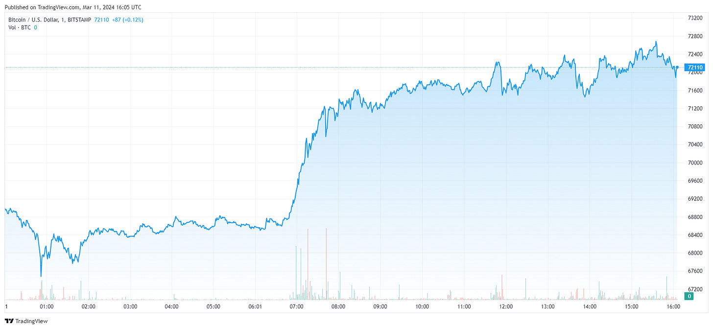 Bitcoin has risen for 6 consecutive days, surpassing 72,000 USD and up nearly 70% this year