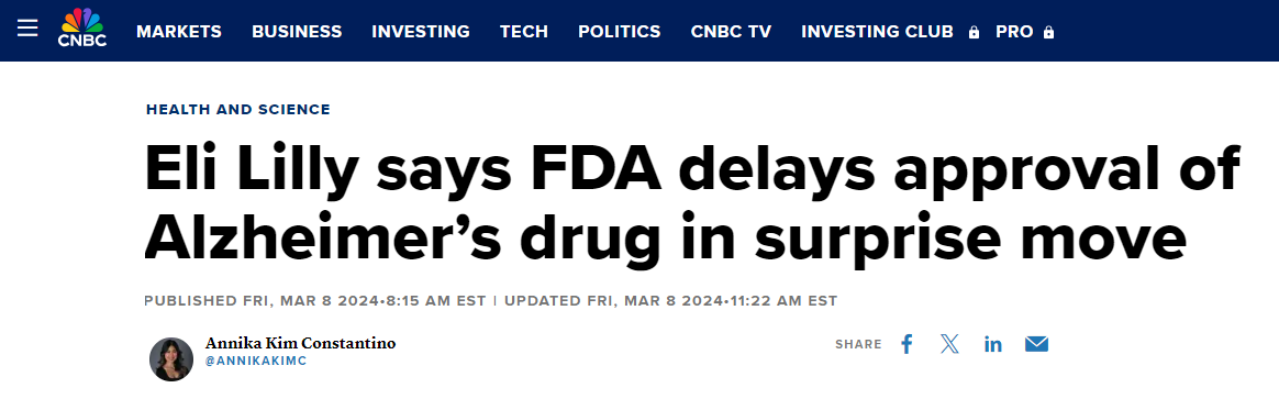 Eli Lilly and Company stock falls due to FDA delaying approval decision on Donanemab - antibody for early symptomatic Alzheimer's patients $BE: