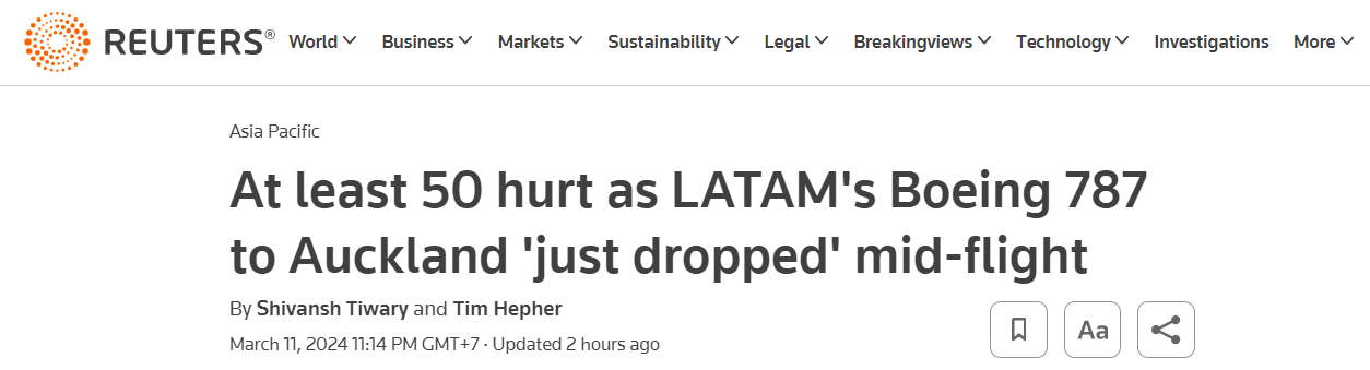 LATAM Boeing plane suddenly loses control while in flight. At least 50 injured when Boeing 787 suddenly drops on flight from Sydney to Auckland