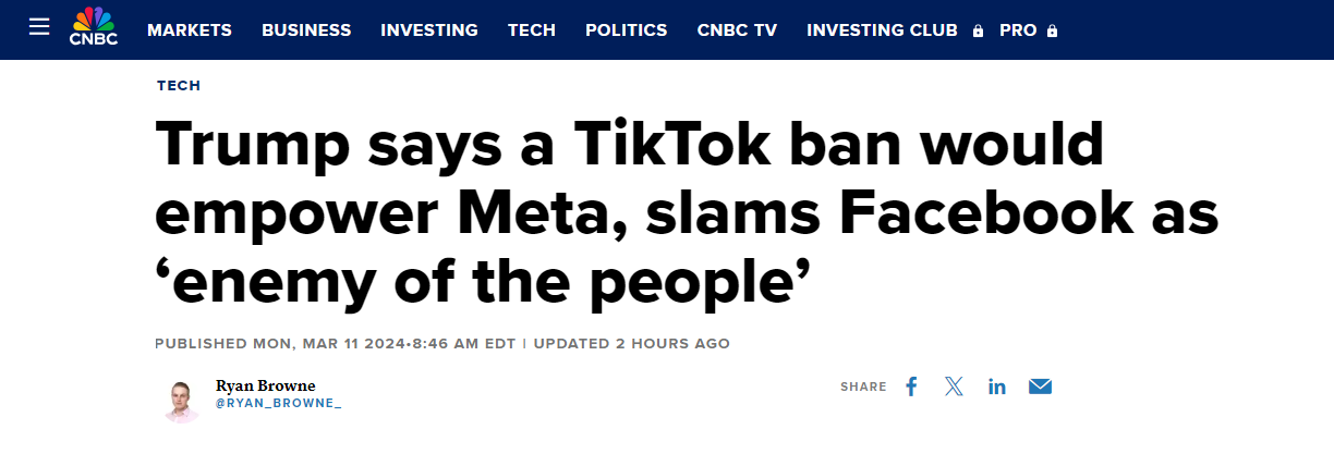 Meta stock down more than 4% after former President Trump said US TikTok ban would only benefit Facebook. He called Facebook "the enemy of the people".