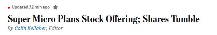 Supermicro stock drops ~10% after announcing plan to issue additional 2 million shares, raising ~$2 billion.