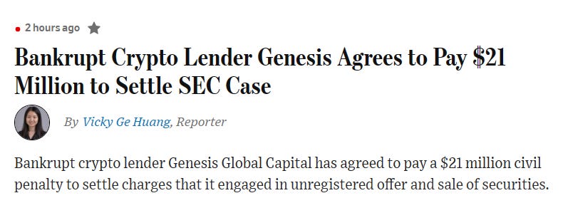 Genesis agrees to pay $21 million fine, closing SEC lawsuit, after 1 year charged with offering unregistered securities through lending program.