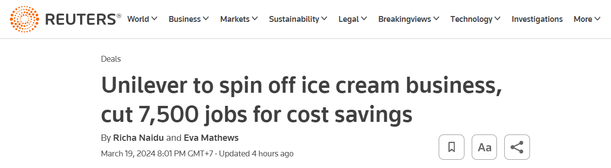 Unilever ceases ice cream business (Magnum and Ben & Jerry's), cuts 7,500 jobs to save costs