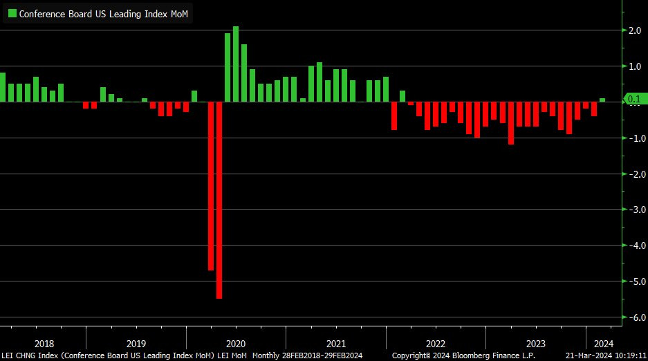 Leading Economic Index (LEI) for February unexpectedly rises again, +0.1% M/M, after a series of declines since February 2022