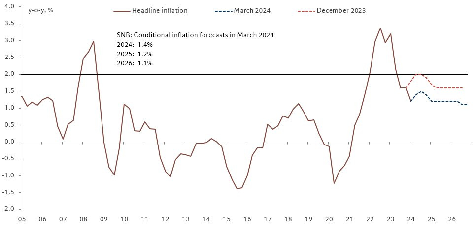 Inflation expectations sharply revised downward suggest another SNB rate cut is very likely in June to 1.25%.