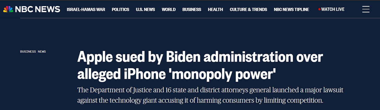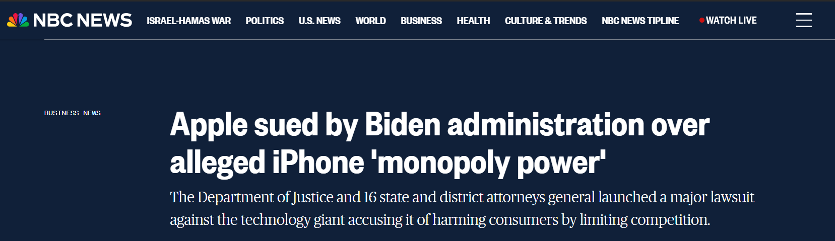 U.S. government sues Apple over smartphone market monopoly allegations.